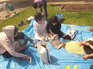 さあ、みんなで協力して土を混ぜようね!頭の中では、おいしいおにぎりを思い浮かべながら、一生懸命に土作りをしている中等部の生徒と先生たちでした。