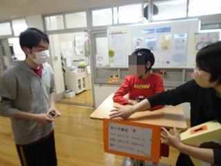 「あなたにとって優しい人とは?」自分でプレゼンテーションを作成して、やりとりをしています。片方のパソコンは、ベルトで板に固定しています。操作は難しいけれど、慣れてくるとスムーズになります。休憩時間も忘れて頑張っていました。3人での学習ゲームです。「1番に挑戦したい人?」の質問に、「はい。」とすかさず手が上がります。やる気満々の高等部です。