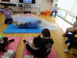 からだの学習の開始です。ペアの先生と息を合わせながら、一緒に頑張ります。様々な身体の動かし方や弛め方を学んでいきます。