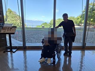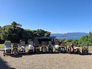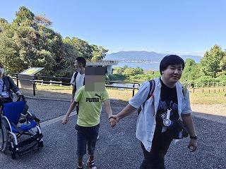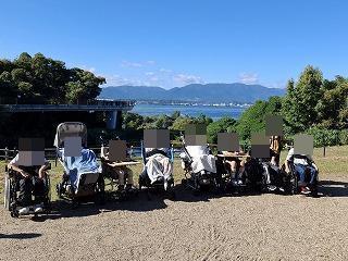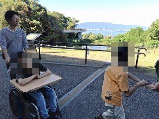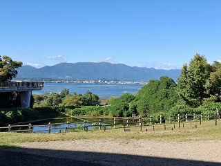 博物館見学を終えて、琵琶湖が見える庭で記念撮影をしました。楽しかったね!
