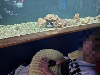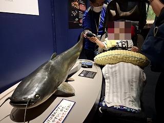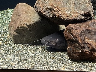 会いたかったビワコオオナマズに出会えました。実物はちょっと恥ずかしがり屋で石の間に隠れていましたが、模型には触ることもできました。