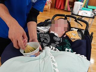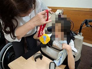 小学部2組、自立活動の授業です。様々な音や手の感触を、先生と一緒に楽しみながら学習を進めました。自分の好きな音を鳴らして、ウキウキしながら笑顔で身体を動かす場面もありました。今日は、たくさんの先生たちに見られたけれど、先生の優しい表情と声かけのおかげで、安心して頑張れました。