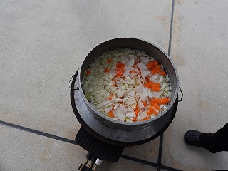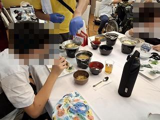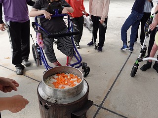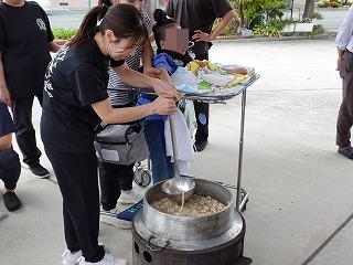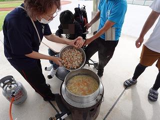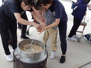 大きなお鍋に、地域の農家さんから分けていただいた野菜やお肉を入れて、豚汁を作ります。このお鍋で100人分の豚汁が作れるそうです。アルファー化米は、非常用のご飯です。いろんな味があるので、その場でじゃんけん大会が始まりました。
