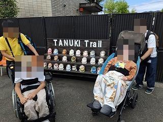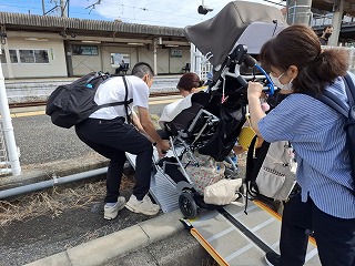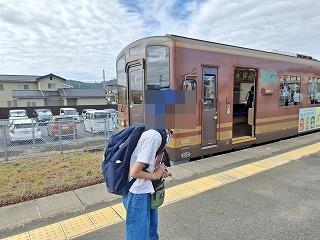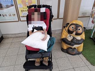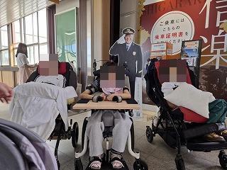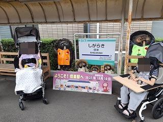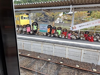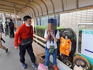 信楽高原鐵道の貴生川駅に到着しました!スロープを使ってホームに乗り込みました。タヌキや吉幾三さんと記念撮影です。