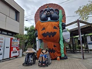 信楽駅前には巨大なタヌキもいましたよ。何と、ハロウィンバージョンになっていました。