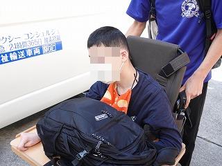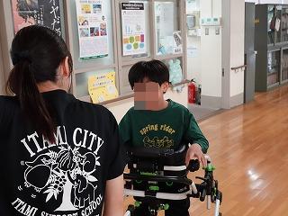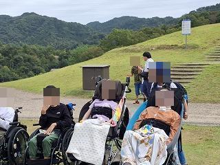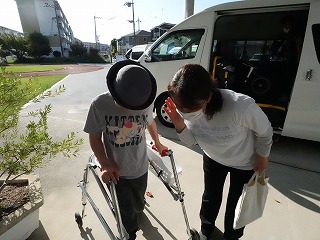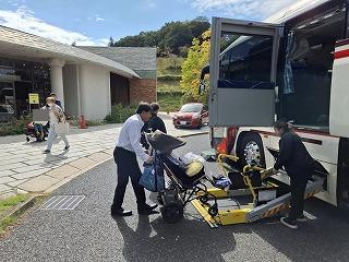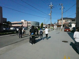 高等部の生徒たちが、学校間交流で伊丹市立伊丹高等学校の体育祭に参加するため、学校を出発しました。昨年度は悪天候のために中止になったのですが、今日はとても良いお天気です。高等部9名全員そろっての出発です。