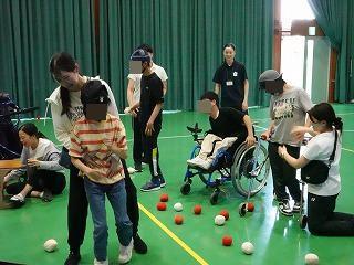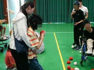 高等部の生徒たちが、西宮支援学校との学校間交流に向けて、その時一緒にするゲームの予行演習をしました。体育館を2つに分けて、それぞれ紅組、白組とします。相手の陣地にたくさん玉を投げ入れた方が勝ちというルールです。