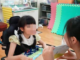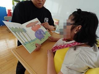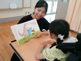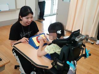 小学部1組の「国語・算数」の授業です。先生としっかり目を合わせ、あいさつしたり自分の好きな方を選んだりできました。先生がとても上手に読んでくれるので、絵本の世界に引き込まれていました。絵本のページは自分でめくりました。音の鳴るころころオルゴールやミニドームは、手を伸ばして自分で操作しました。