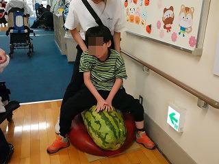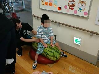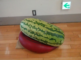 学校の玄関ロビーに巨大スイカが出現しました。栄養教諭の先生が、みんなに見てもらうために持ってきてくれました。「これ、本当にスイカなの?」という声。確かにスイカって丸い物だと思っていたら、これは横長ですもんね。小学部の子どもたちが、大きなスイカにまたがってみました。