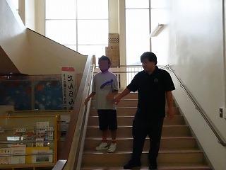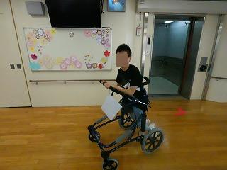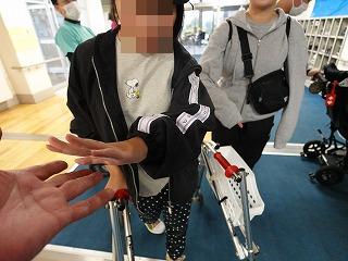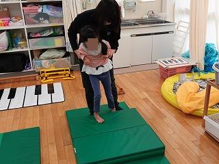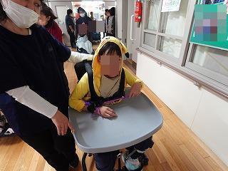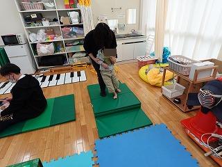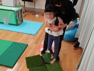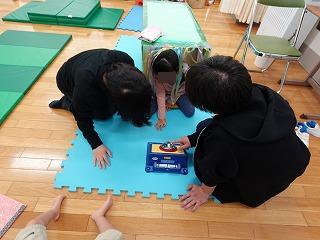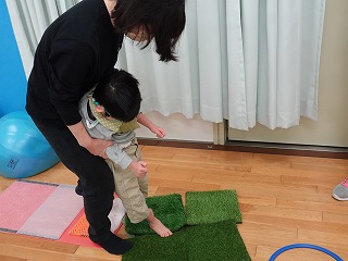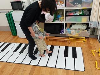 小1組、朝のサーキット運動です。小学部1年生の2名が取り組みました。まずは、音の鳴る大きな鍵盤を歩きます。先生に補助をしてもらいますが、自分で足を動かして1歩ずつ歩きます。1歩踏み出す度に音が鳴るので、それも励みになります。