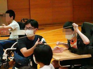 次は、「陣取り合戦」をしました。伊丹特別支援と西宮支援の混合チームが赤と白に分かれて対戦しました。結果は、1回戦も2回戦も、赤組の勝利でした。勝ったチームは、大喜びです。