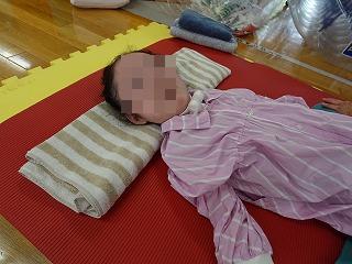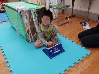 裸足で芝生を歩いたり、マットの山を乗り越えたりもします。最後は四つん這いになってトンネルを抜けました。トンネルの先にはご褒美のお気に入りのおもちゃです。何とも言えない達成感のある表情を見せてくれました。