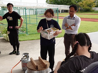 高等部の生徒と中学部の生徒が、一緒に加熱具合を確認しに行きました。熱した後は、まっすぐになるように上から押します。これから飾りをつけて完成です。うまくできたかな?来年度、高等部に入学してくれるのを楽しみに待ってるよ。